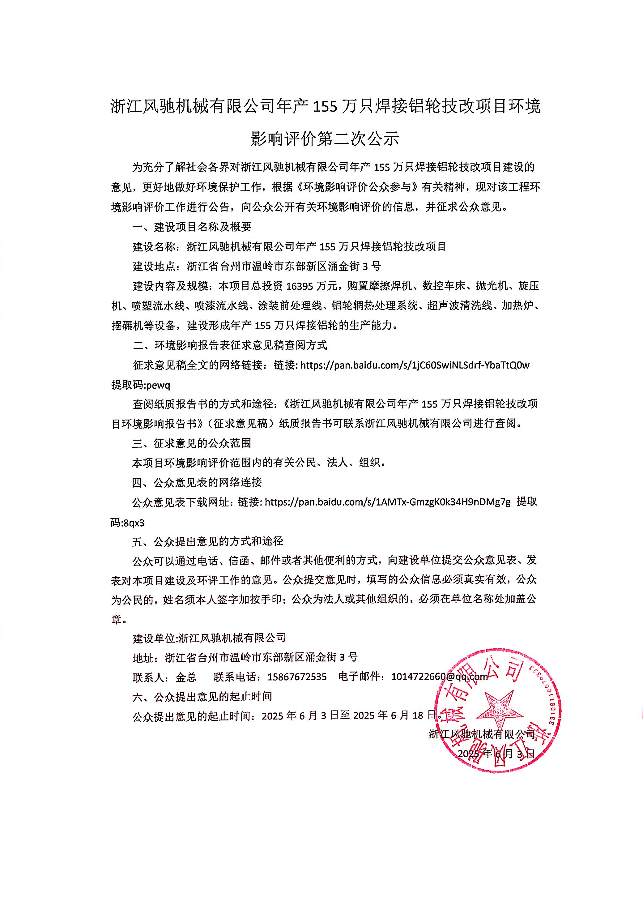 浙江風馳機械有限公司年產155萬只焊接鋁輪技改項目環境影響評價第二次公示